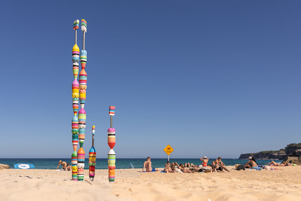• Tom de Munk-Kerkmeer (WA), 'Broad Band Cool Drink Tribe', Sculpture by the Sea, Bondi 2025. Photo Charlotte Curd